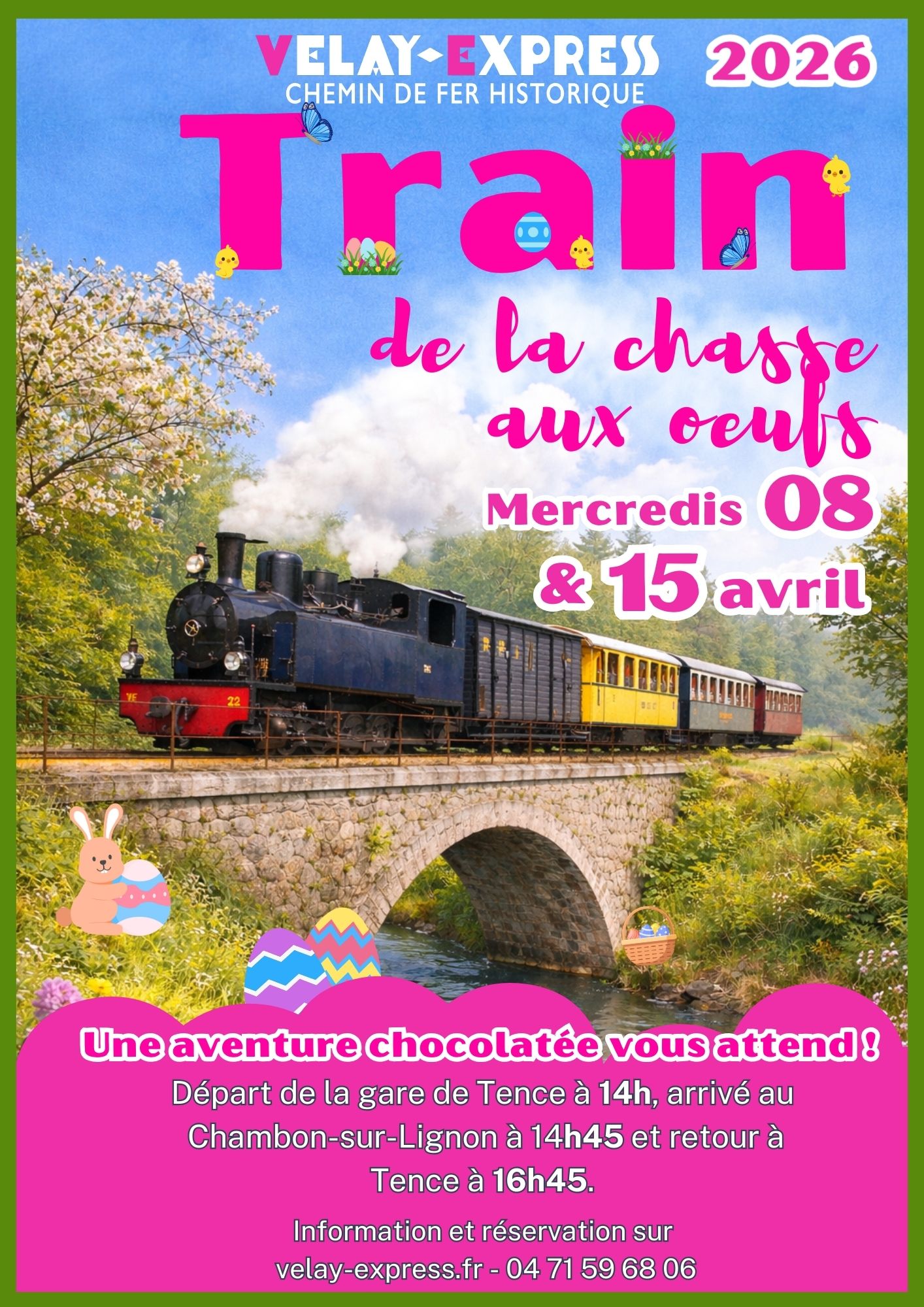 À bord d’un authentique train à vapeur, vivez une chasse aux œufs pas comme les autres. Direction la pleine nature pour dénicher les œufs, dissimulés entre les arbres et les fourrés, qui seront ensuite échangés contre de délicieux chocolats. Entre rires, goûter et surprises, la magie de Pâques opère à chaque instant.